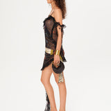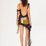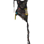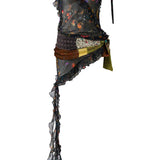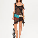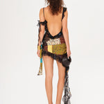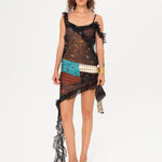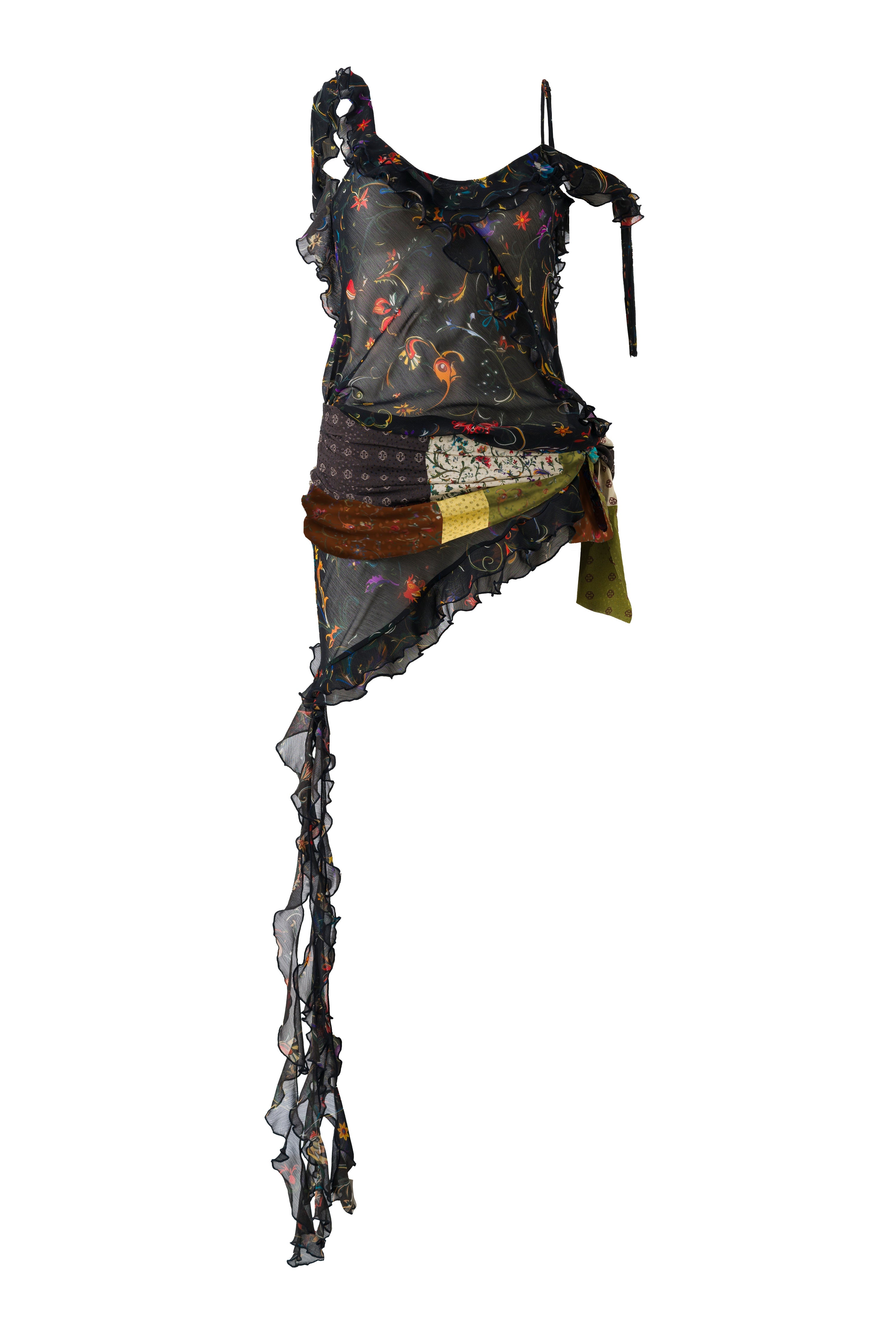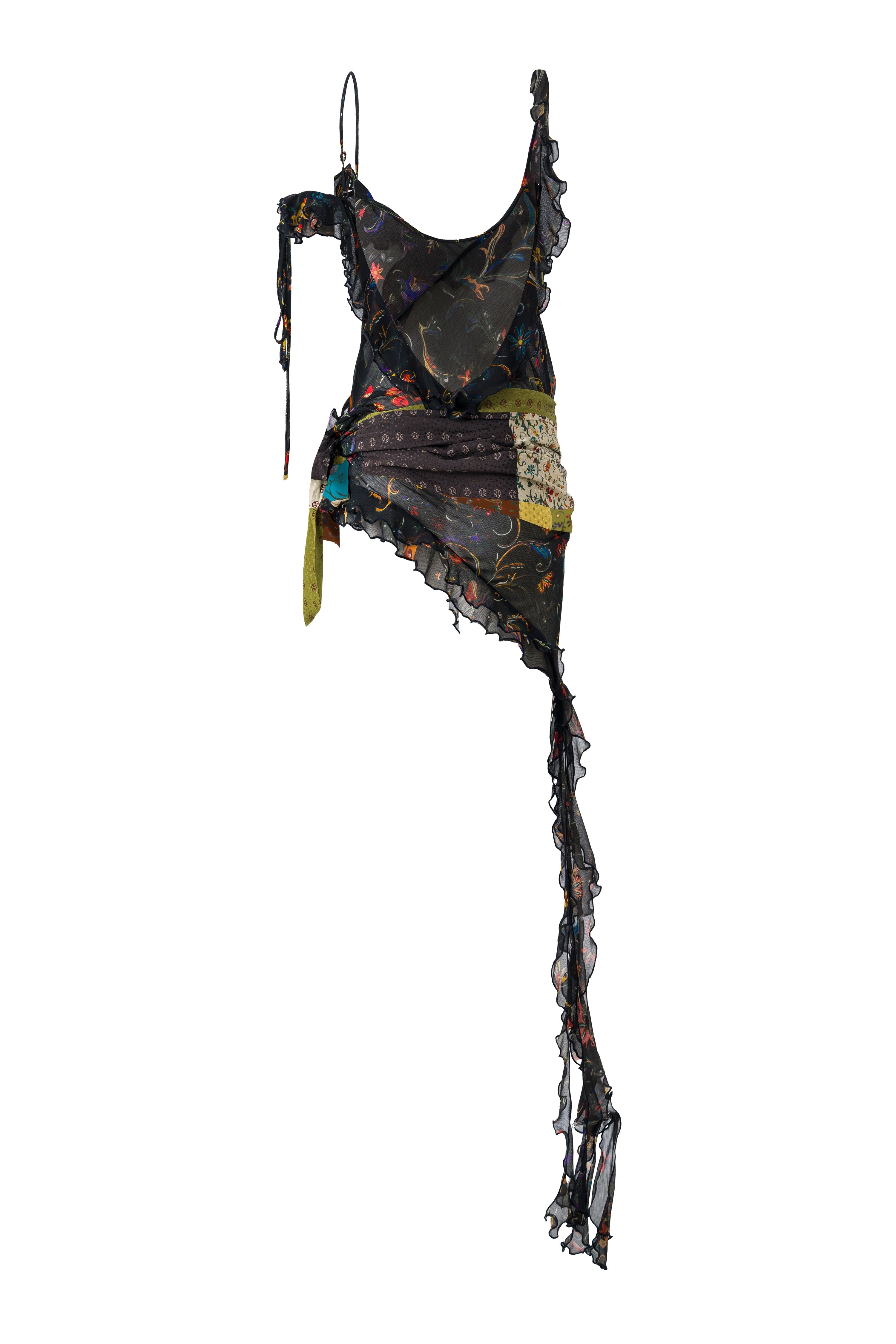• Asymmetric ruffled hem with an elongated, cascading frill trim