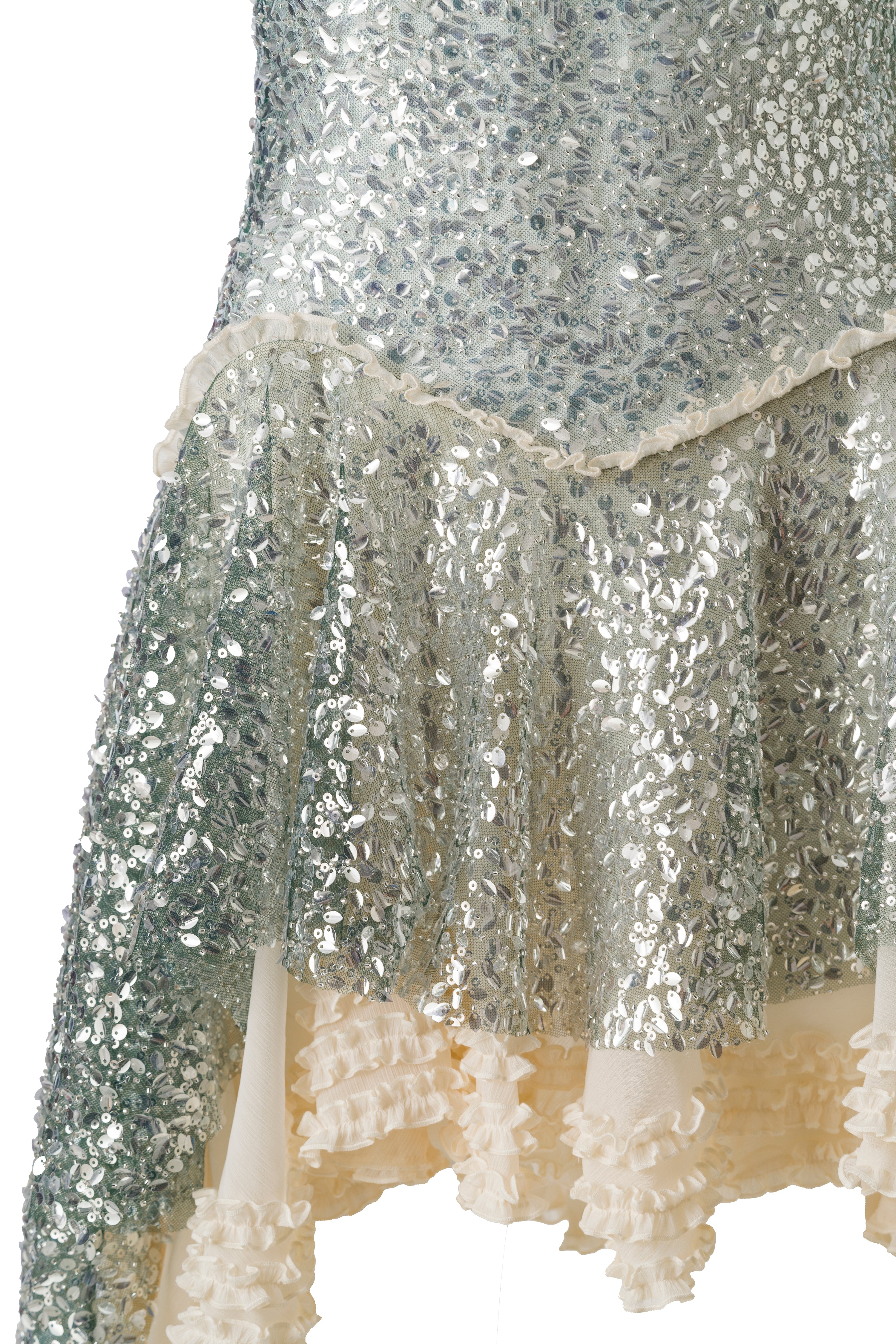 - Layered over sheer ruffled panels